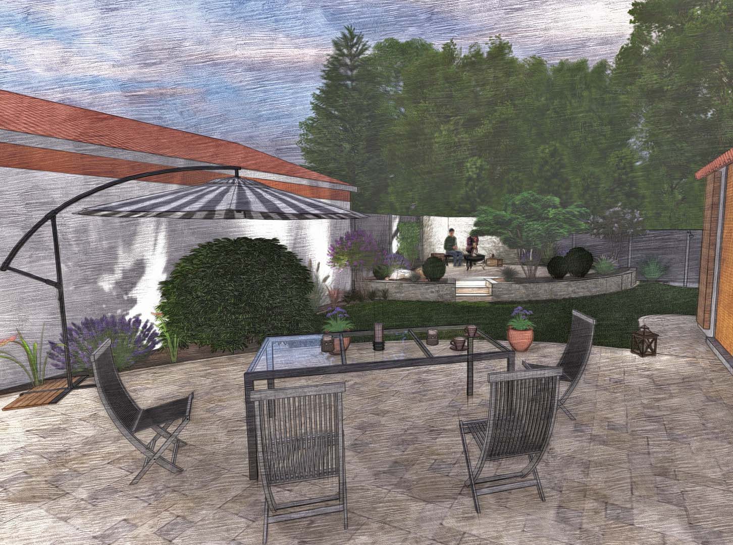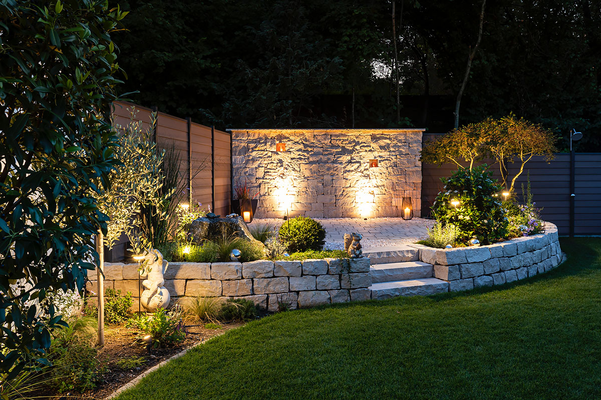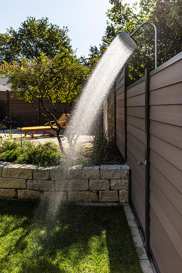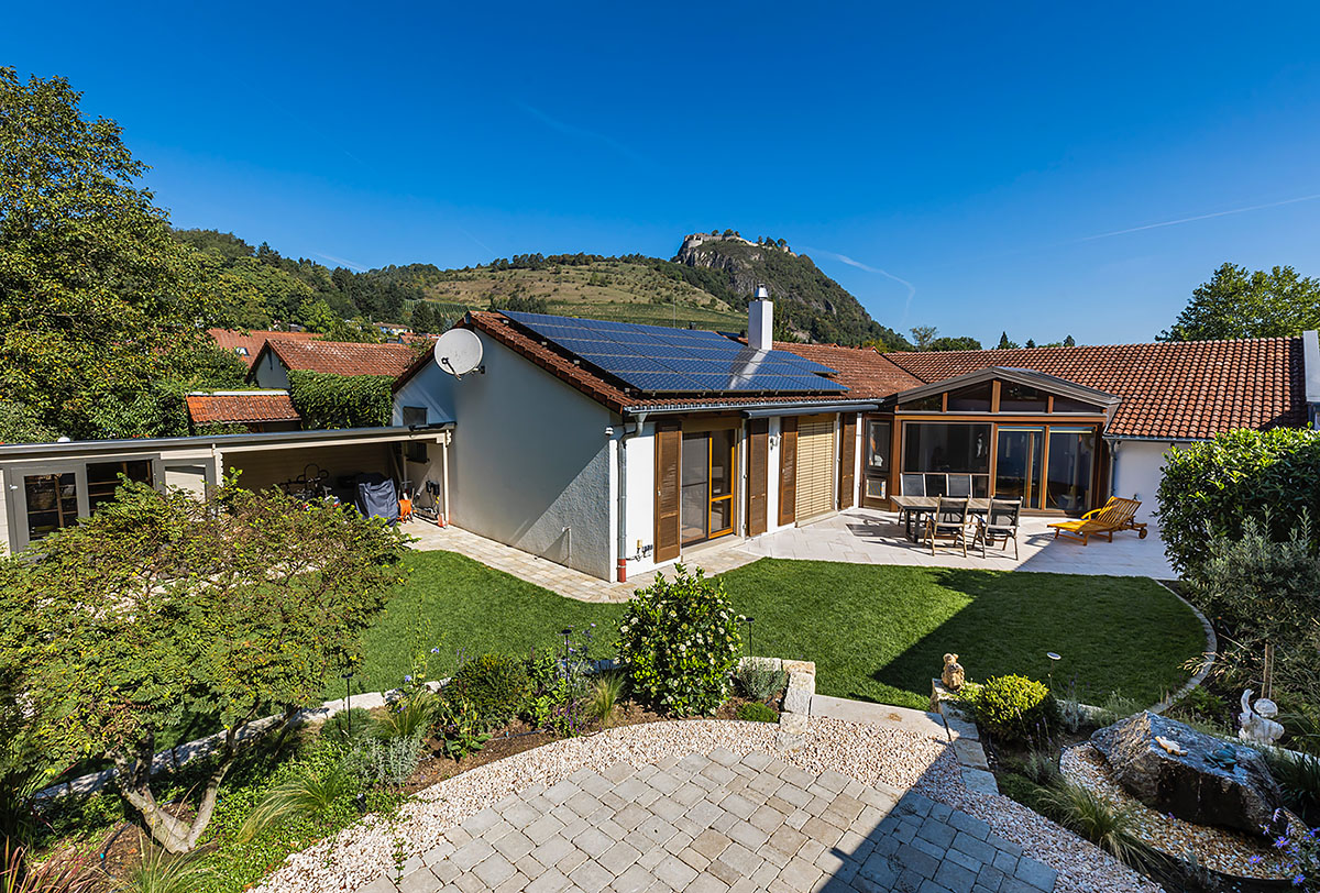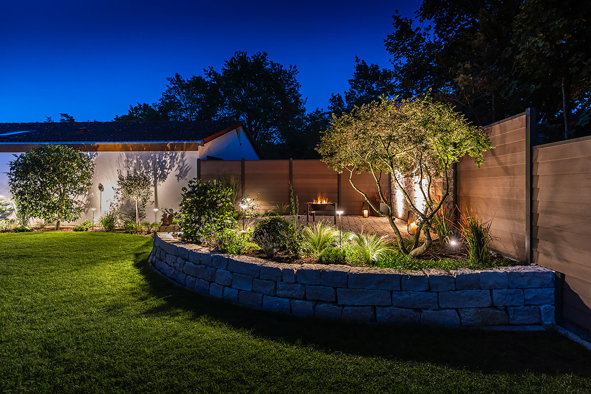 Der Clou dieses Gartens ist sein Freisitz, die Aussichtsebene und Ruheecke für entspannte Genießermomente. Dieser bietet durch die leichte Erhöhung einen fantastischen Ausblick auf das Wahrzeichen Singens und des Hegaus, dem Hohentwiel. Gleich daneben befindet sich am Sichtschutz eine Außendusche für die Erfrischung an und nach heißen Sommertagen. Wenn die Dämmerung einsetzt kommt das moderne Beleuchtungskonzept zum Tragen. So entsteht eine einzigartige Atmosphäre am Abend. Da nicht nur Optik, sondern auch Funktionalität und einfach Bedienung wichtig sind, können Beleuchtung und Bewässerung von jeweils einem zentralen Punkt auf modernste Weise gesteuert werden.