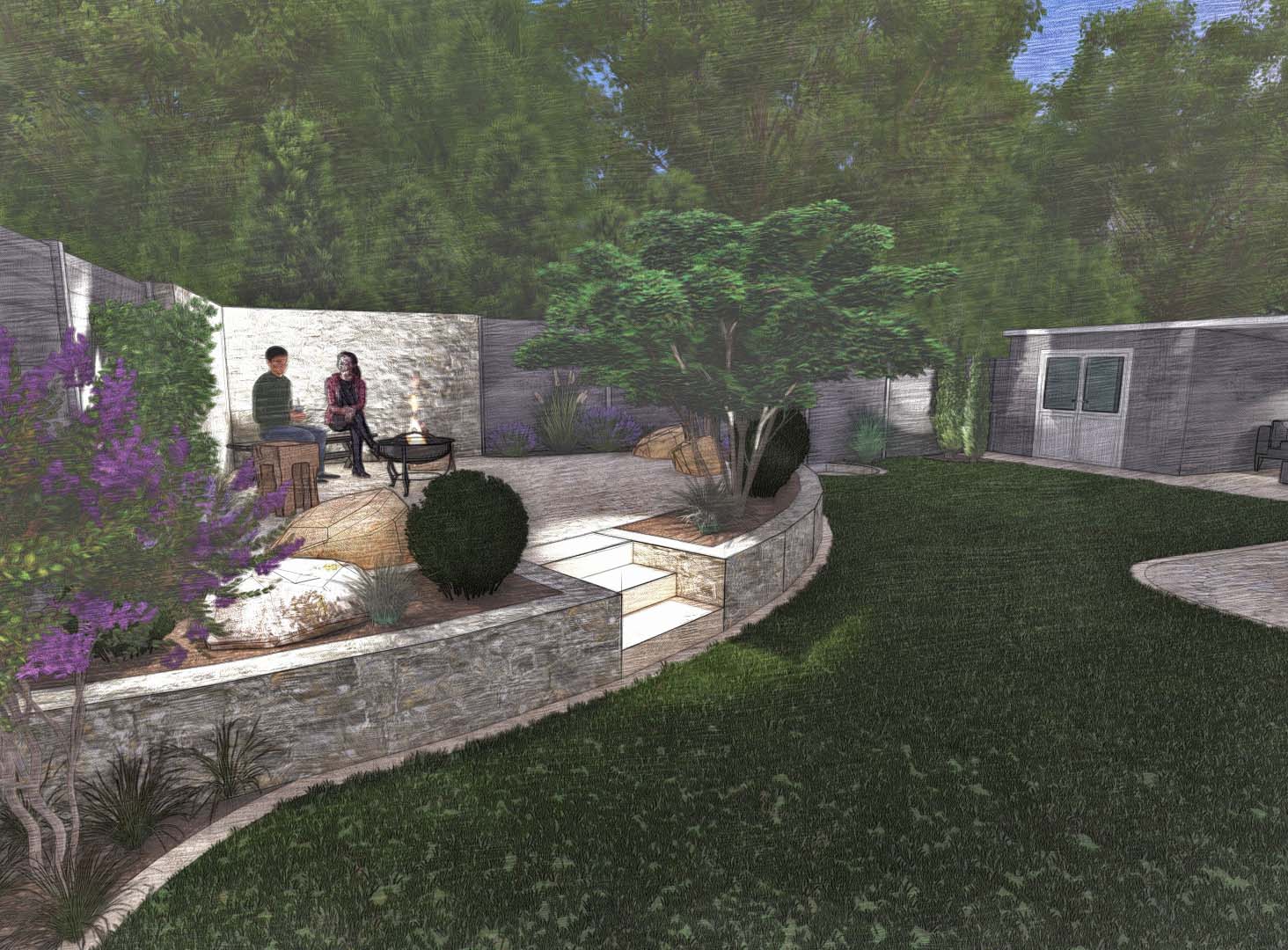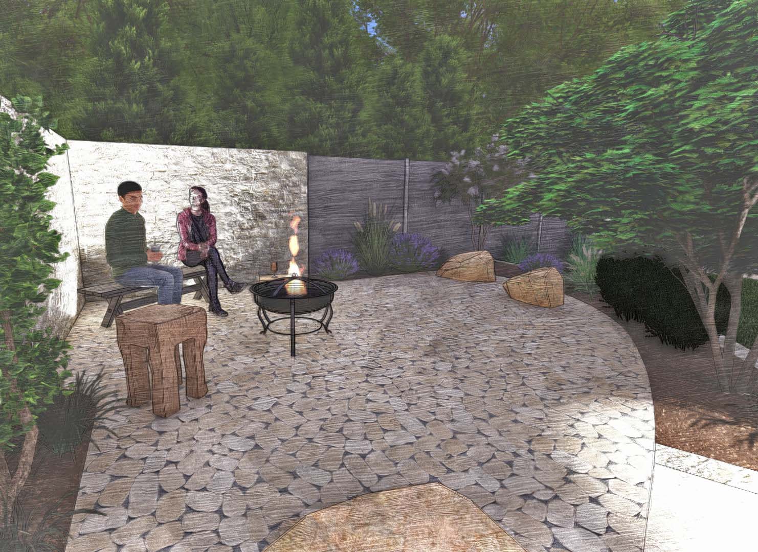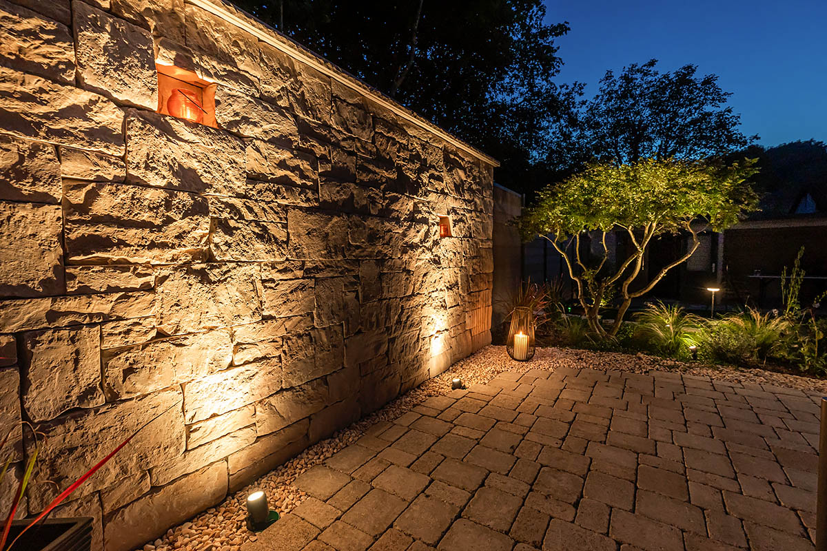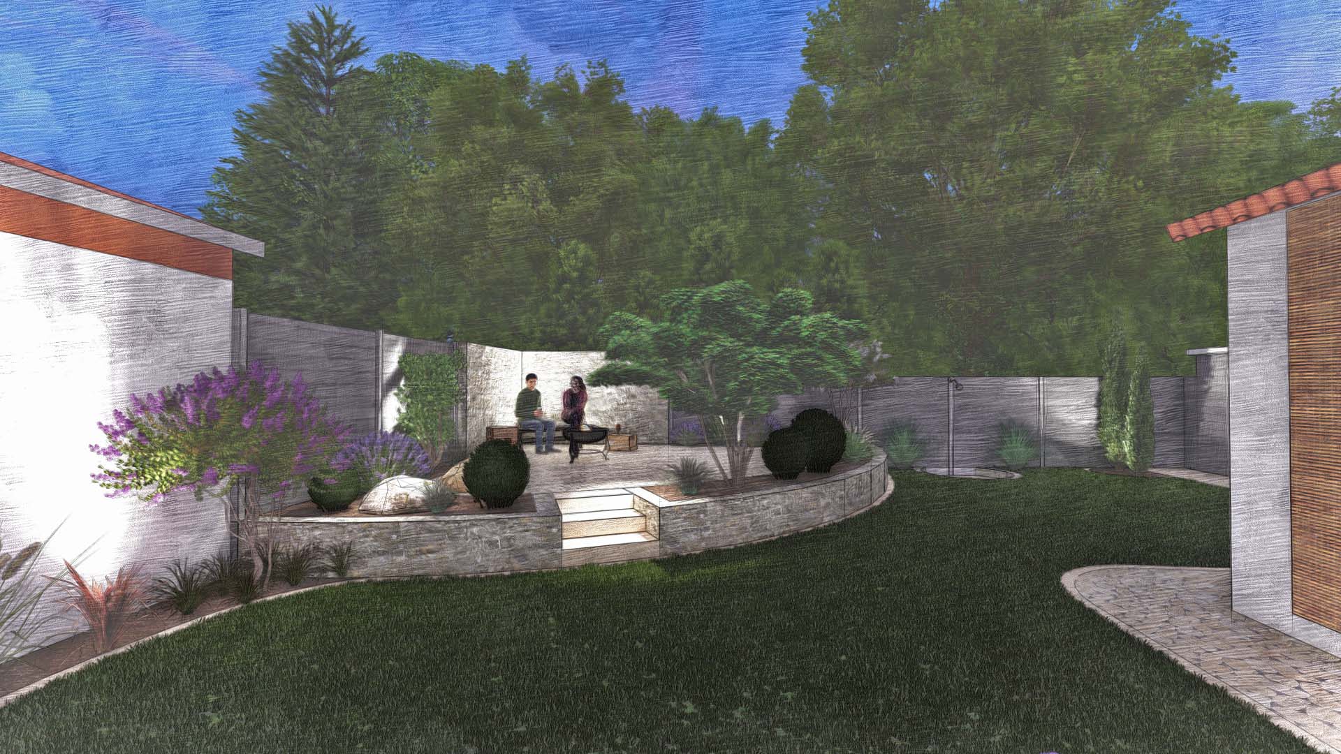 Der Clou dieses Gartens ist sein Freisitz, die Aussichtsebene und Ruheecke für entspannte Genießermomente. Dieser bietet durch die leichte Erhöhung einen fantastischen Ausblick auf das Wahrzeichen Singens und des Hegaus, dem Hohentwiel. Gleich daneben befindet sich am Sichtschutz eine Außendusche für die Erfrischung an und nach heißen Sommertagen. Wenn die Dämmerung einsetzt kommt das moderne Beleuchtungskonzept zum Tragen. So entsteht eine einzigartige Atmosphäre am Abend. Da nicht nur Optik, sondern auch Funktionalität und einfach Bedienung wichtig sind, können Beleuchtung und Bewässerung von jeweils einem zentralen Punkt auf modernste Weise gesteuert werden.
